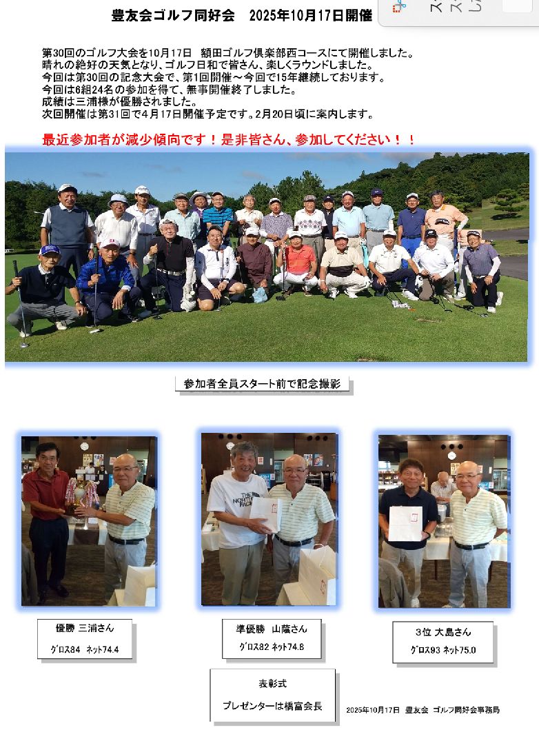 募集は八月以降に予定、多くの皆様の参加をお願いします。 (4月14日記載) ★第二回の豊友会ゴルフコンペが開催されました。 10/21(木)時々小雨の中、笹戸カントリークラブにて37名の参加、イン・アウト各五組の同時スタートしました。