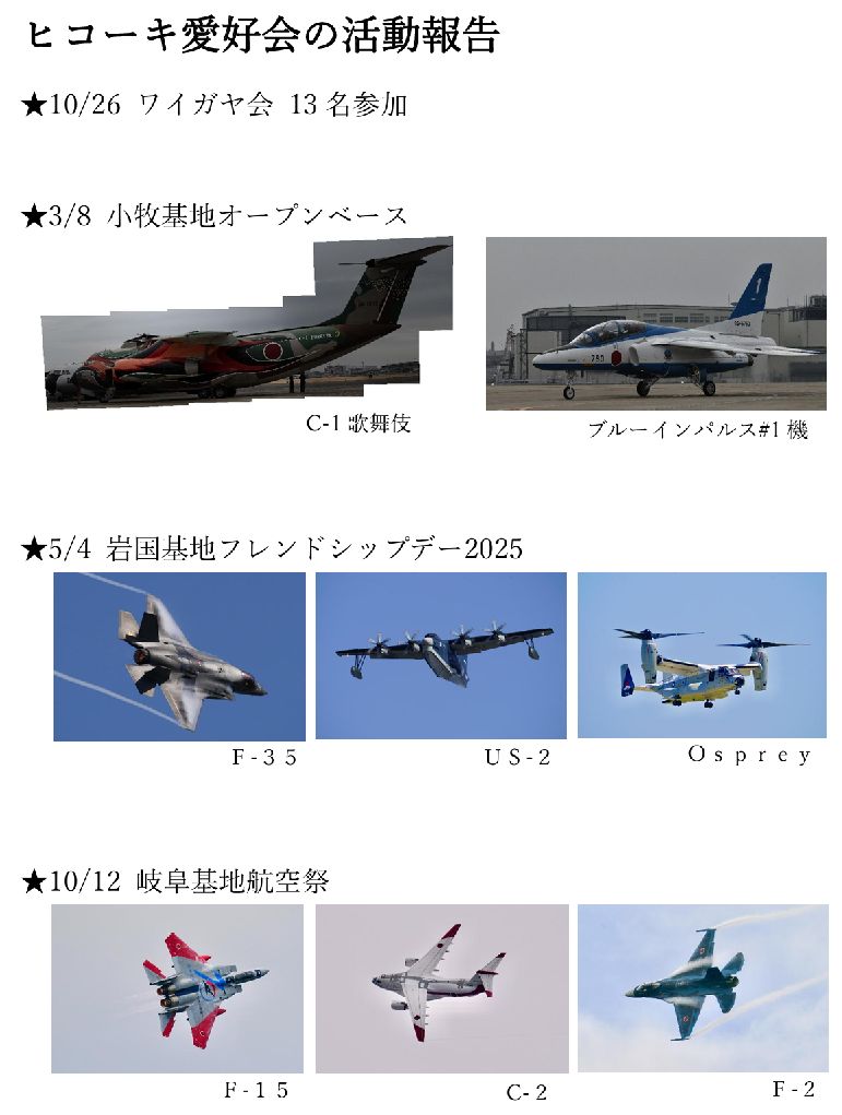 惜しくも入賞を逃しました石王豊三郎さんも「インで37」でした。 次回は神谷さんと柴田さんが幹事となります。 来年の4月中旬に第3回豊友会ゴルフ大会を計画しております。今回不参加の皆様にはぜひとも次回に出席戴きますようお願いします。 (10月25日記載) ★ヒコーキ愛好会が、10月3日(日)石川県小松基地航空祭に参加してきました。